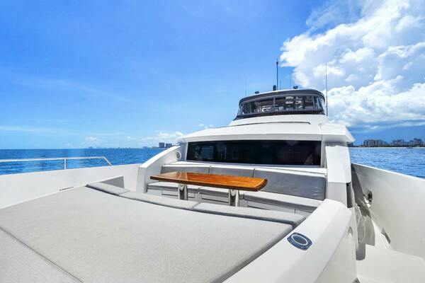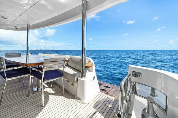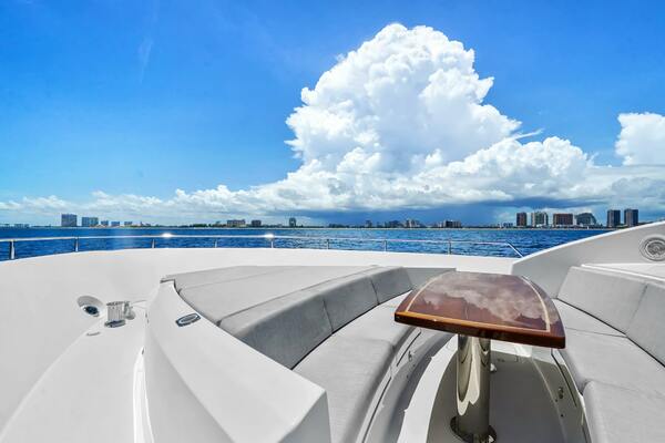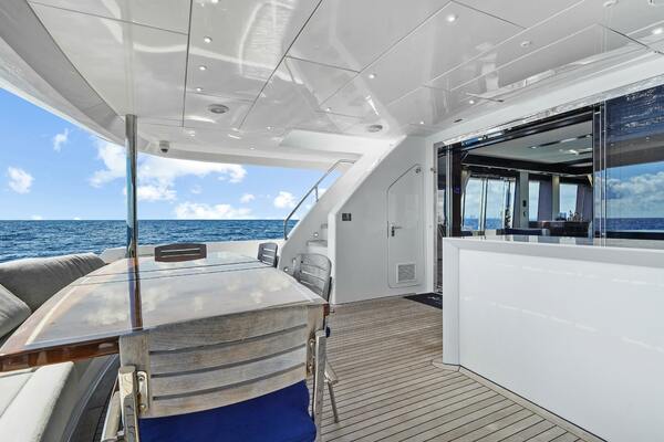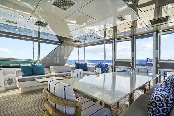 - Custom flybridge arrangement with modified seating and layout