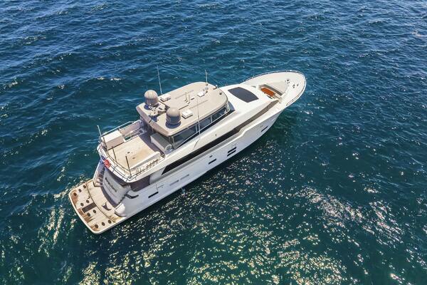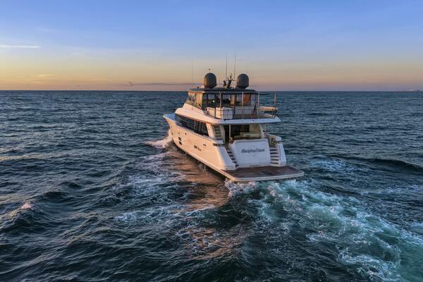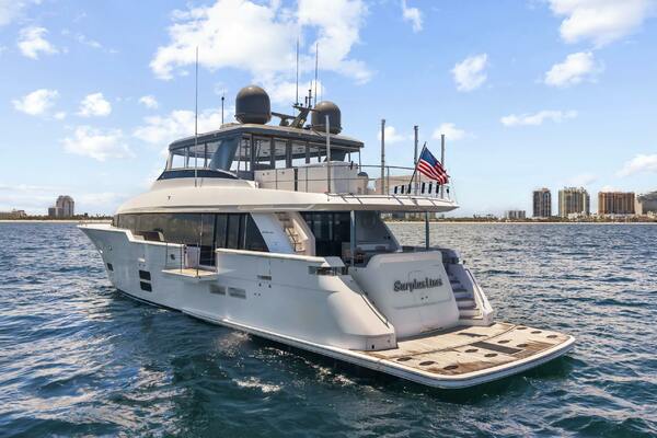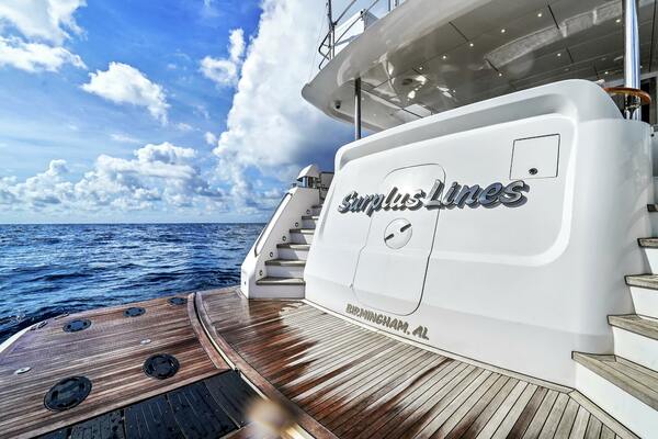 The Hatteras M90 Panacera "SURPPLUS LINES," delivered in 2019, is a custom-built motor yacht designed for a large family, boasting over $2 million in custom features. Powered by Caterpillar C32A 1900hp engines (2200 hours) with a CAT360 joystick control system, ensuring performance and comfortable cruising.The yacht's interior includes a modern salon with sliding glass doors leading to a foldout balcony to port, formal dining area, and a country galley, all with elegant furnishings and ample space. Below deck, 10 guests are accommodated in 4 guest staterooms, all en-suite, including a full-beam master stateroom, a VIP stateroom, and two convertible guest staterooms each with three twin berths.