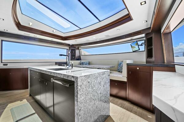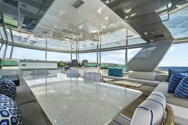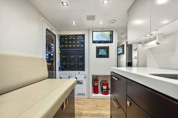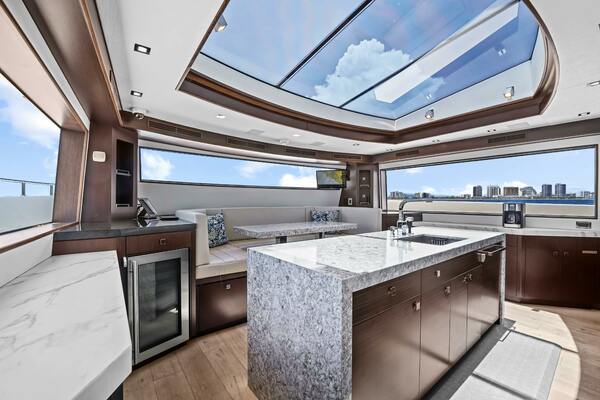 The expansive salon is modern with white-oak sole and light-tone furnishings, a club chair to port, and a large L‐shaped sofa with storage to starboard. Large windows and indirect lighting enhance the salon’s open feeling. Sliding glass doors leading to a foldout balcony to port.Forward of the salon is a formal dining area with a Release Marine table accommodating eight guests, and a buffet cabinet housing fine china, an ice maker, and a drink fridge. Internal stairs facing aft lead to the bridge deck.