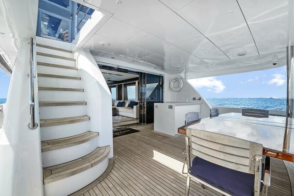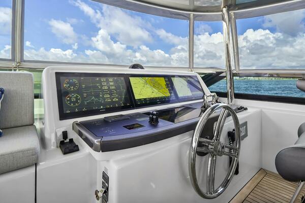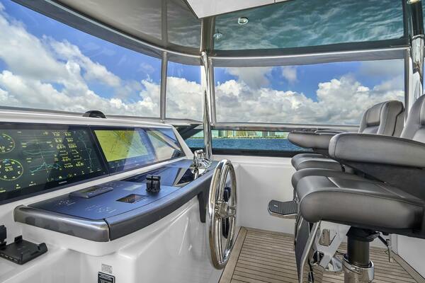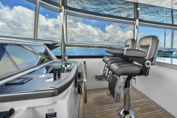 The flybridge is accessible via a custom interior stairway with an electric sliding door from the salon, or through the stairwell from the aft deck. Although it is an open‐bridge model, the flybridge features a custom enclosure, providing the best of both worlds. Whether you prefer the open air or the comfort of 48,000 BTU air‐conditioning, the bridge deck offers flexibility. The enclosure maintains an open‐bridge feel without restricting visibility and allows the side curtains to be pinned up against the hardtop for a true open‐ air experience. Forward to port, the flybridge offers a U‐shaped seating area raised 5 inches for improved visibility while cruising. The helm is forward to starboard, equipped with two Stidd helm chairs.Just aft of the seating, a built‐in cabinet to port houses a custom cooler connected to an Eskimo ice machine with exceptional output. To starboard, behind the helm chairs, there is a cabinet with a sink and three drink fridges. Further aft, you'll find a large L‐shaped built‐in couch with storage underneath, accompanied by two Release Marine cocktail tables. To port, a dining table for eight is available, with a dropdown TV integrated into the hardtop. All audiovisual systems are controlled via Crestron iPad controls. For docking, both port and starboard sides of the flybridge feature wing stations, each with bow and stern thruster controls, CAT360 joystick control, and throttles for precise maneuvering and excellent visibility.