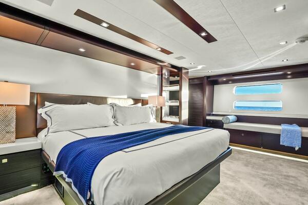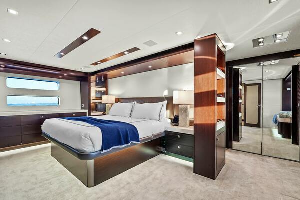 The master stateroom, located midship and aft, boasts an impressive amount of space, offering significantly more volume than previous Hatteras 90 Panacera builds, with an additional 22 inches both forward and aft. The centerpiece is a king‐size bed with storage underneath, operated by an electric‐powered actuator. To the port side, beneath the window, there's a custom single bed that doubles as a couch or lounge area, perfect for relaxing, reading, or providing an extra bed for children. The thoughtful design extends to the starboard side, where built‐in drawers provide ample storage, and dual closets are located aft and to port. The ensuite bathroom is equally luxurious, featuring heated floors, a large double vanity, and a spacious walk‐in shower. Just outside the master lies the custom coffee bar, it holds a drink fridge below, room for a coffee machine on the counter top and glassware storage above.
