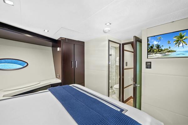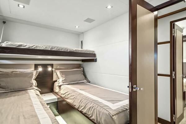 The portside stateroom offers flexible sleeping arrangements, with three twin beds that can be converted into a queen by sliding the two lower bunks together. This cabin also features an ensuite head and shower, complete with heated floors for added comfort. The audiovisual systems are conveniently controlled through Crestron iPad controls, ensuring ease of use.