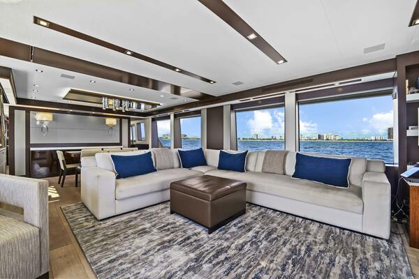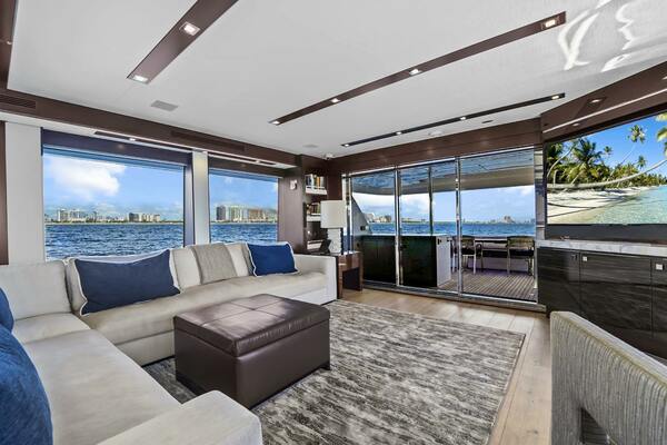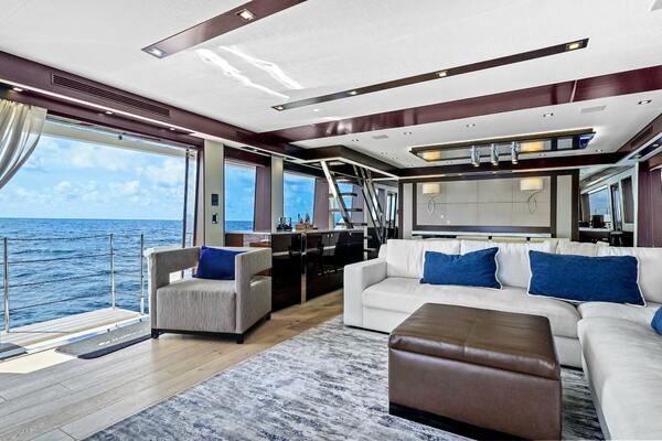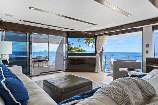 - A port side salon opening to a custom balcony with triple sliding glass doors.