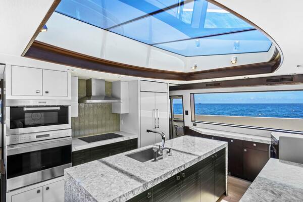 The galley is ideal for cooking and entertaining, with upgraded Wolf appliances, a Sub‐Zero refrigerator, and a wine cooler. The space comfortably seats six at the forward dinette, with skylights and large windows providing an abundance of natural light.GUEST ACCOMMODATIONS