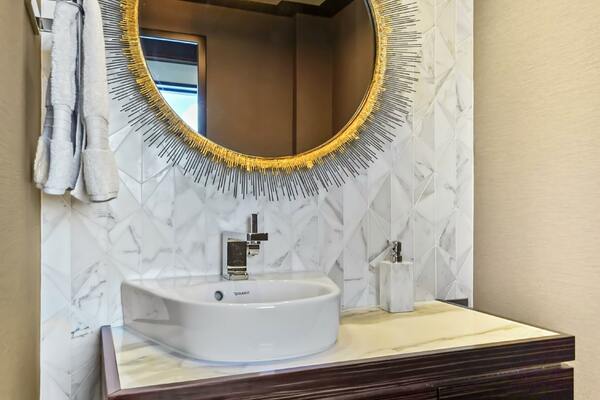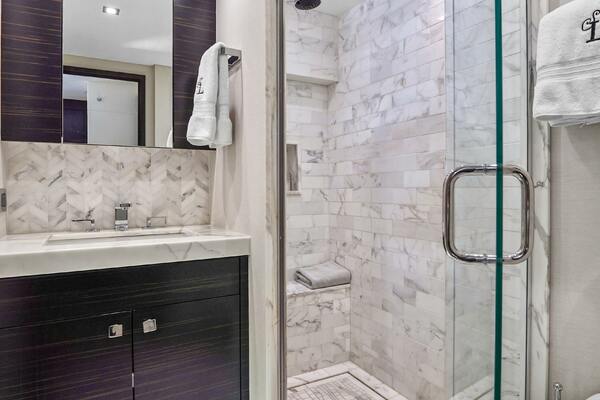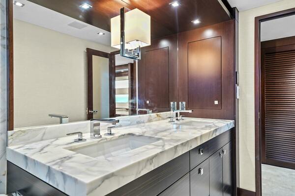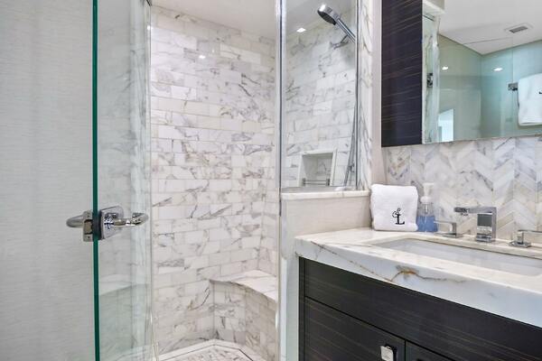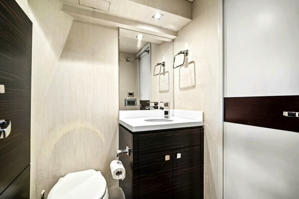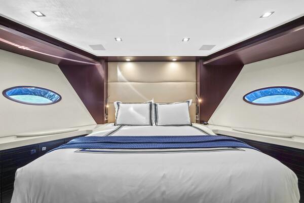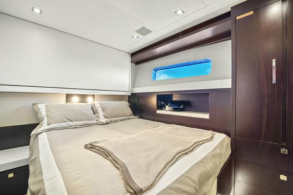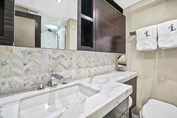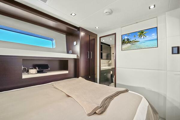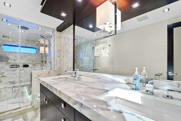 The VIP forward stateroom has a centerline queen berth with an ensuite bathroom featuring heated floors. Blackout shades, electric blinds and Crestron controls keep your guests comfortable.