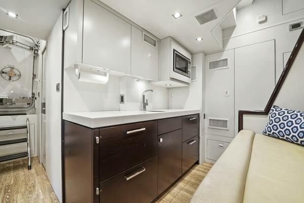 The crew area can be accessed either via a stairway from the aft deck or directly from the swim platform. Inside, there is a comfortable lounge with a settee and a compact galley that features four Sub‐Zero refrigeration drawers, a stainless steel sink, a microwave, and storage cabinets. Beneath the crew sofa, you'll find custom dive tank storage, and the space is plumbed to fill the dive tanks while they remain in their racks. A dedicated closet in the lounge is designed to store wet gear such as life jackets and rain gear, allowing them to dry properly. Accommodations for up to four crew members include a starboard cabin with a queen‐size bed and a portside cabin with bunks. Both cabins share a head and shower, providing a comfortable living space for the crew.- Custom crew arrangement with modified crew lounge and crew portlight