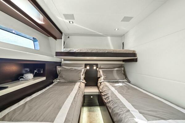 The starboard stateroom offers versatile sleeping options, with three twin beds that can be reconfigured into a queen by sliding the two lower bunks together. This cabin also includes an ensuite head and shower, featuring heated floors for extra comfort. The cabin's audiovisual systems are managed through Crestron iPad controls, providing a high‐tech, intuitive experience.